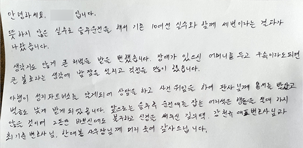 생각지도 않게 큰 처벌을 받을 뻔했습니다. 장애가 있으신 어머니를 두고 구속이라도 되면 큰 불효자라는 생각에 밤잠을 설치고 걱정을 많이 했습니다.