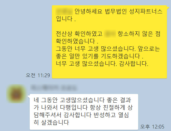 의뢰인 감사후기 본문 네 그동안 고생많으셨습니다.좋은 결과가 나와서 다행입니다.항상 친절하게 상담해주셔서 감사합니다.반성하고 열심히 살겠습니다. 담당변호사 김의택대표변호사 강천규대표변호사 김준우변호사 안나단변호사 처분 집행유예 목록 이전글의뢰인 감사후기 24.08.12 다음글의뢰인 감사후기 24.05.13
