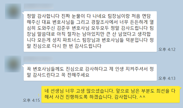 꼭 변호사님들께도 진심으로 감사하다고 제 인생 지켜주셔서 정말 감사드린다고 꼭 전해주세요.