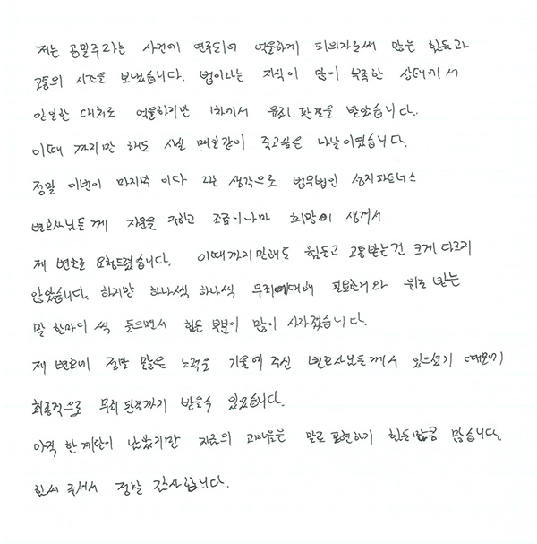 제 변호에 정말 많은 노력을 기울여주신 변호사님들께서 있으셨기 때문에 최종적으로 무죄판결까지 받을 수 있었습니다.