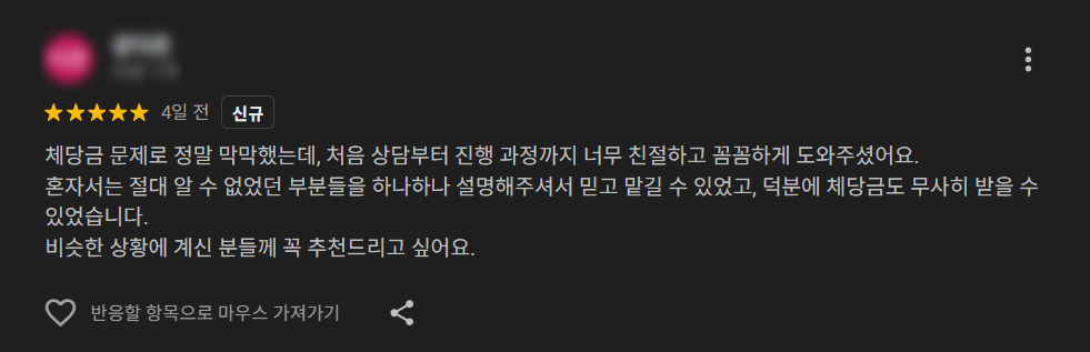 의뢰인 감사후기 본문 체당금 문제로 정말 막막했는데, 처음 상담부터 진행 과정까지 너무 친절하고 꼼꼼하게 도와주셨어요.혼자서는 절대 알 수 없었던 부분들을 하나하나 설명해주셔서 믿고 맡길 수 있었고, 덕분에 체당금도 무사히 받을 수 있었습니다.비슷한 상황에 계신 분들께 꼭 추천드리고 싶어요. 담당변호사 왕건수석 변호사 처분 승소 목록 이전글의뢰인 감사후기 26.01.15 다음글의뢰인 감사후기 25.12.18