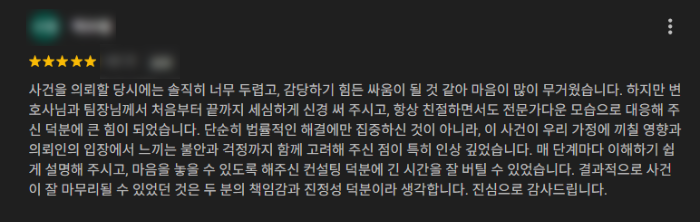 사건을 의뢰할 당시에는 솔직히 너무 두렵고, 감당하기 힘든 싸움이 될 것 같아 마음이 많이 무거웠습니다. 하지만 변호사님과 팀장님께서 처음부터 끝까지 세심하게 신경 써 주시고, 항상 친절하면서도 전문가다운 모습으로 대응해 주신 덕분에 큰 힘이 되었습니다. 단순히 법률적인 해결에만 집중하신 것이 아니라, 이 사건이 우리 가정에 끼칠 영향과 의뢰인의 입장에서 느끼는 불안과 걱정까지 함께 고려해 주신 점이 특히 인상 깊었습니다. 매 단계마다 이해하기 쉽게 설명해 주시고, 마음을 놓을 수 있도록 해주신 컨설팅 덕분에 긴 시간을 잘 버틸 수 있었습니다. 결과적으로 사건이 잘 마무리될 수 있었던 것은 두 분의 책임감과 진정성 덕분이라 생각합니다. 진심으로 감사드립니다.